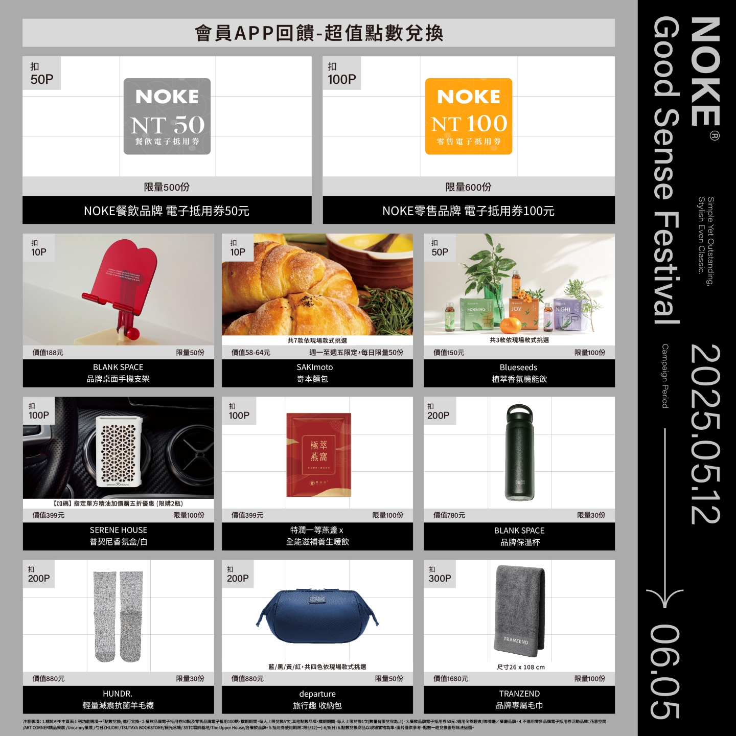 注意事項:1.請於APP主頁面上列功能選項⮕「點數兌換」進行兌換。2.餐飲品牌電子抵用券50點及零售品牌電子抵用券100點,檔期期間,每人上限兌換5次;其他點數品項,檔期期間,每人上限兌換1次(數量有限兌完為止)。3.餐飲品牌電子抵用券50元:適用全館輕食/咖啡廳/餐飲品牌。4.不適用零售品牌電子抵用券活動品牌:花意空間/ART CORNER精品策展/Uncanny策展/勺日ZHUORI/TSUTAYA BOOKSTORE/極光冰場/SSTC雪訓基地/The Upper House/各餐飲品牌。5.抵用券使用效期:限5/12(一)-6/8(日)6.點數兌換商品以現場實物為準,圖片僅供參考,點數一經兌換後恕無法返還。
