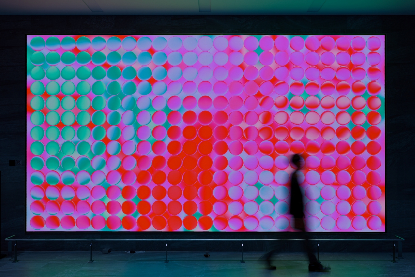 在冬天的氛圍中, 這件互動裝置作品以「折射」與「溫度」為核心概念,構築出人與光、折射與能量之間的感知互動。作品由上百個透明圓形玻璃體組成,排列成牆面結構,而玻璃的背後則是流動的色彩。