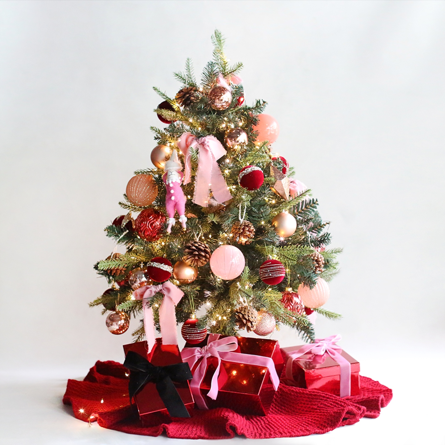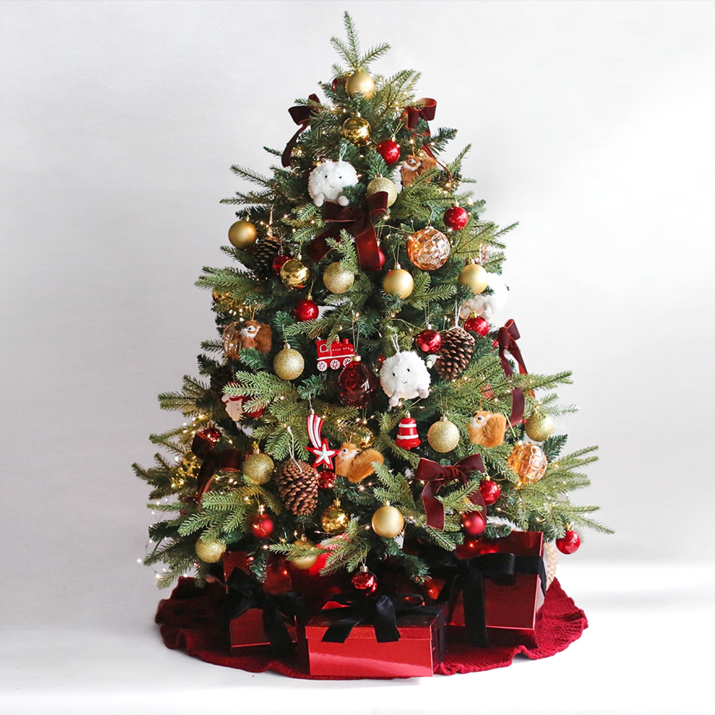 組合商品含仿真聖誕樹一座、精選吊飾套裝、樹裙一式、變段式氛圍燈串 ※不含情境示範的禮物盒 ※本商品非新鮮聖誕樹 (需自行組裝)